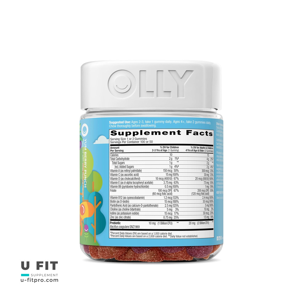 پاستيل مولتی‌ویتامین و پروبیوتیک کودک اُلی یک مکمل خوشمزه و مفید برای کودکان است که با ترکیبی از ویتامین‌های A, C, D, E، گروه B و روی و پروبیوتیک‌های زنده، به تقویت سیستم ایمنی، سلامت گوارش و رشد ذهنی و جسمی کودکان کمک می‌کند. این محصول بدون گلوتن، وگان و جذاب برای کودکان طراحی شده است.(تولید امریکا)