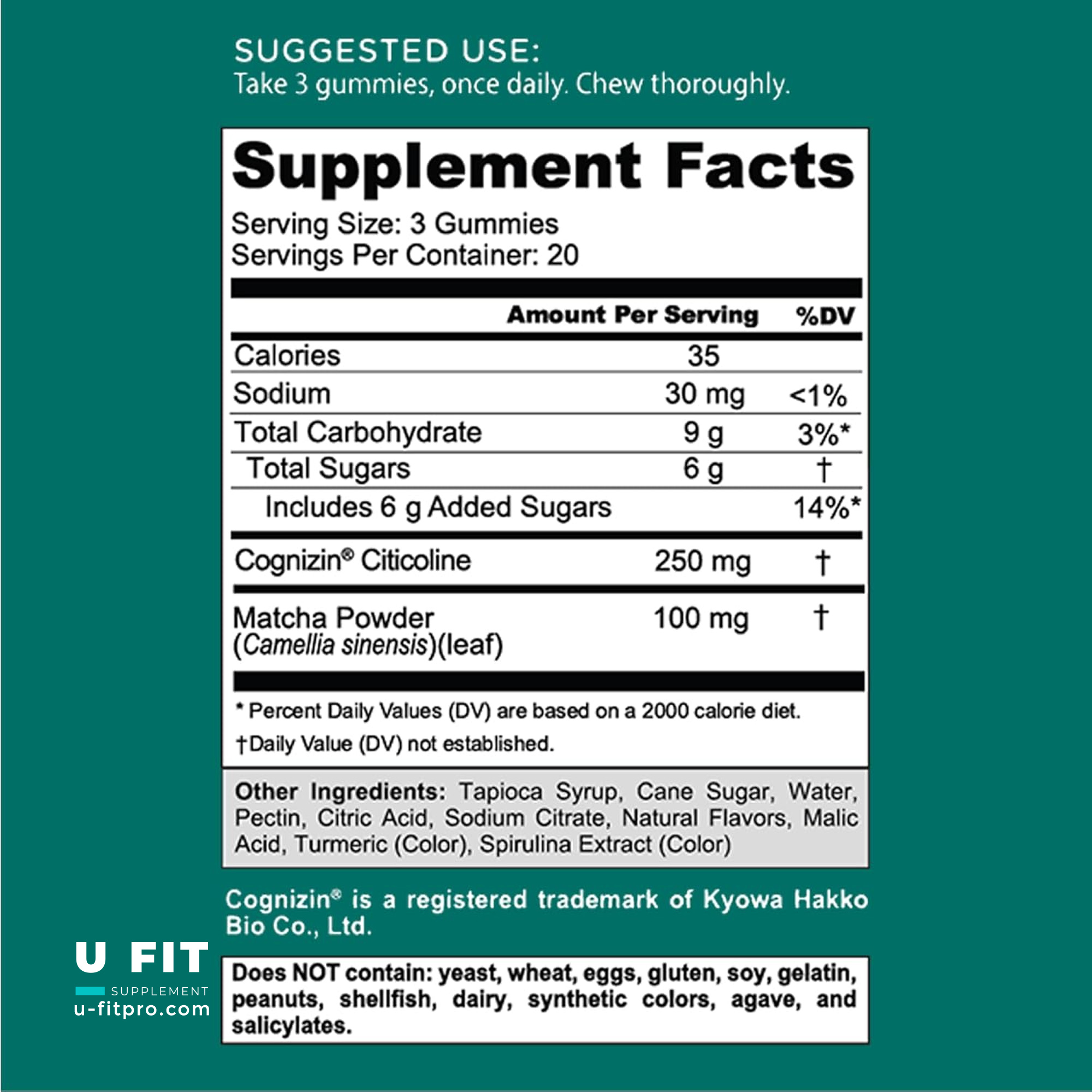 هر سروینگ شامل ۲ تا ۳ پاستیل است که با تامین دوز مناسب از پودر چای سبز ماتچا و سینتی کولین (Cognizin)، به افزایش انرژی ذهنی و حفظ عملکرد شناختی کمک میکند. ترکیبات طبیعی مانند زردچوبه و اسپیرولینا اثرات آنتیاکسیدانی ارائه میدهند.