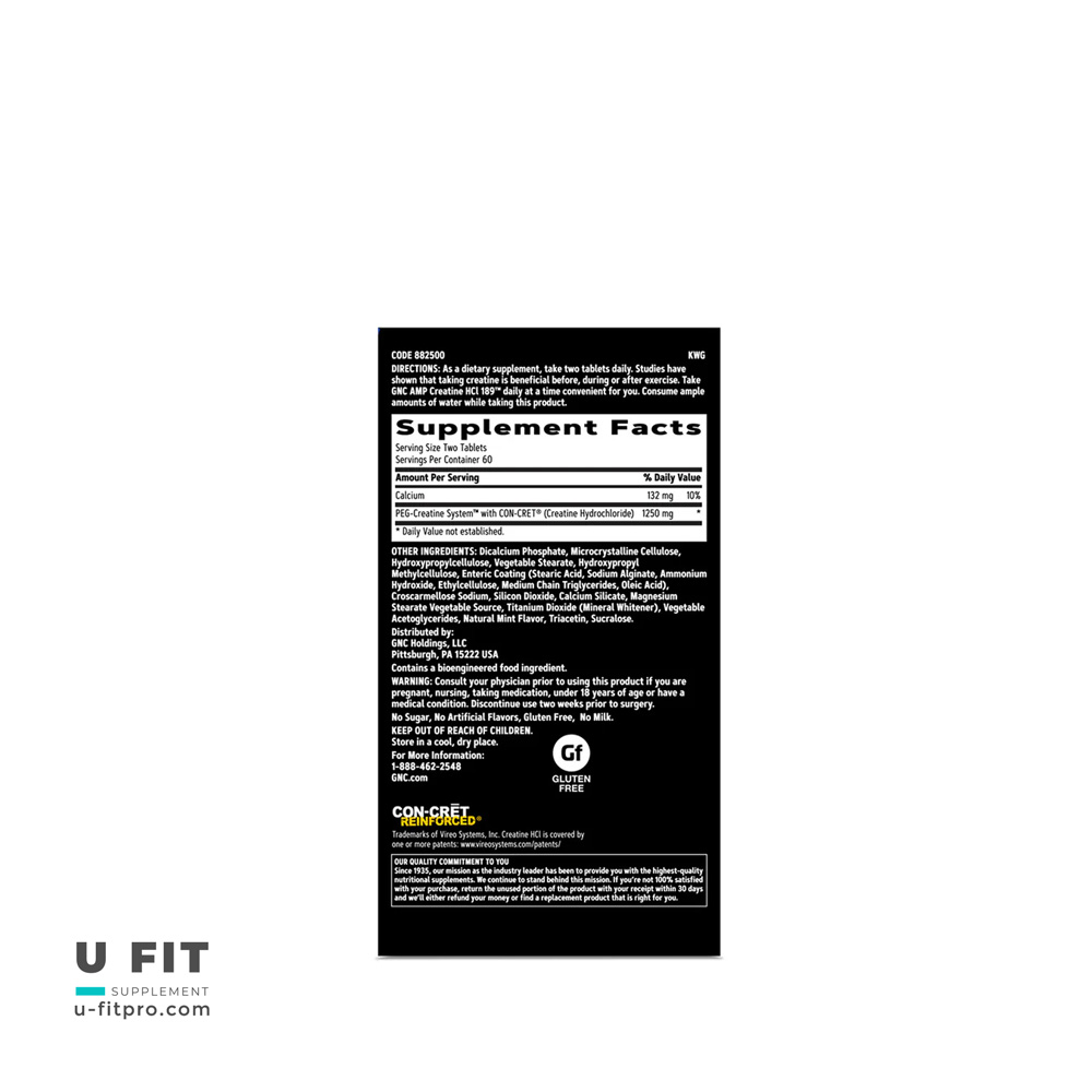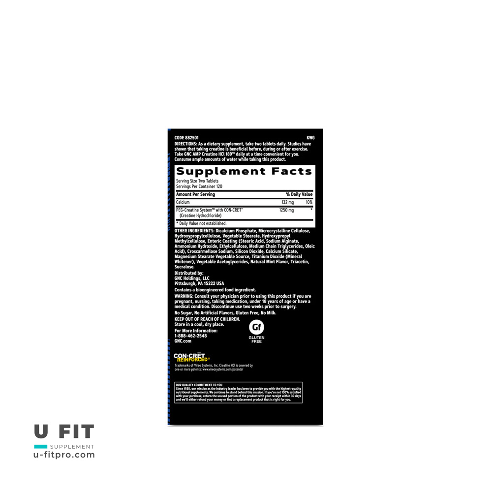 - ترکیبات فعال: PEG-Creatine System™ + CON-CRET® (Creatine HCl) — اطلاعات بیشتر در سایت کمپانی: GNC AMP