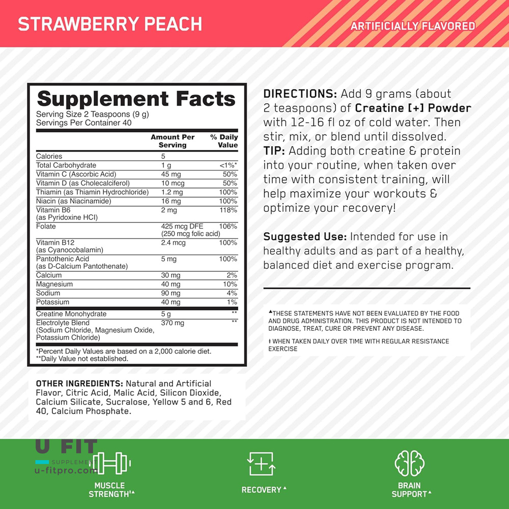 کراتین مونوهیدرات پلاس اپتیموم نوتریشِن یک فرمول پیشرفته برای افزایش قدرت، ریکاوری سریعتر و بهبود عملکرد ورزشی است. هر سروینگ 5 گرم کراتین خالص بههمراه ویتامینهای B، C و D و 370 میلیگرم الکترولیت جهت هیدراتاسیون بهتر فراهم میکند. یک انتخاب عالی برای ورزشکارانی که دنبال انرژی پایدار، افزایش حجم عضلانی و عملکرد حرفهای هستند.(تولید امریکا)