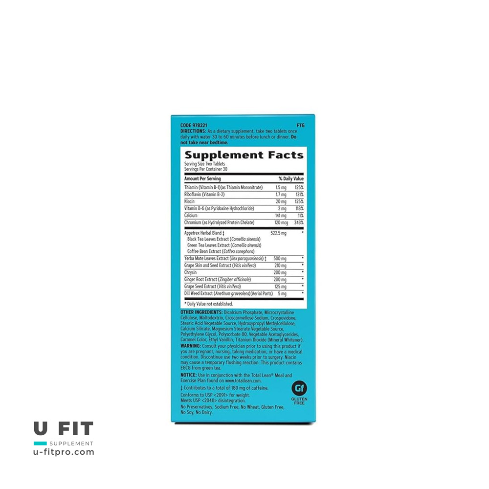 هر سروینگ (۲ قرص) شامل: تیامین (B1) 1.5 mg، ریبوفلاوین (B2) 1.7 mg، نیاسین 20 mg، ویتامین B6 2 mg، کرومیوم 120 mcg، کلسیم 141 mg و ترکیب گیاهی Appetrex Herbal Blend 522.5 mg شامل عصاره چای سیاه، چای سبز، قهوه سبز، یربا ماته، عصاره انگور، زنجبیل، شوید و کریسین می‌باشد.